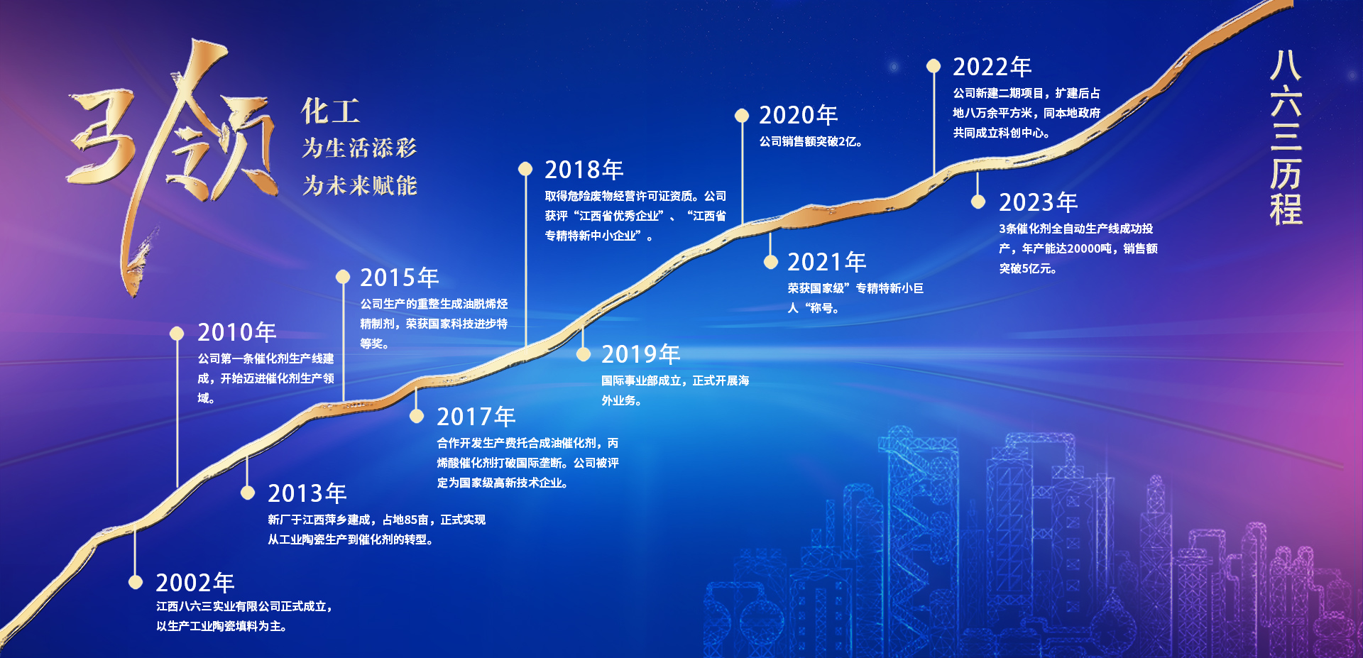 八六三以科技創新(xīn)為(wèi)引擎,推動企業的持續進步與發展,先後榮獲國家級“小巨人(rén)”企業、江西(xī)省高新(xīn)技術企業、江西(xī)省守合同重信用企業、資信等級AAA級、江西(xī)省工程技術中心、石油化(huà)工填料工程技術中心等殊榮。在業務(wù)領域上(shàng),專注于生(shēng)産五大闆塊的産品,分(fēn)别為(wèi)煉油化(huà)工催化(huà)劑、吸附劑、淨化(huà)劑、保護劑、陶瓷填料,涵蓋百餘種優特規格,年産能(néng)已突破20000噸。